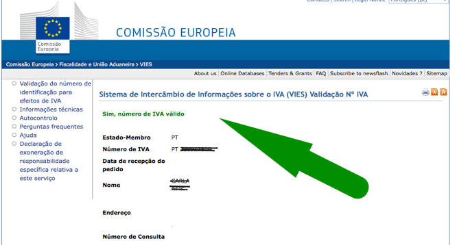 Se estiver activo, aparecem os seus dados e a informação de que o seu número de IVA (o NIF) é válido.
